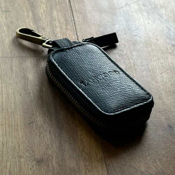 TANWOOD Leather keypod - where you can keep you keys safe with zipper lock . Made from black leather and extra metal loop for hanging. A good and stylish accessory for your keys Measurements: of this length – 8.5 cm width- 5 cm.