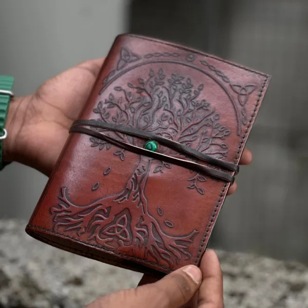 Crafted from premium genuine leather, this handmade leather journal features an elegant embossed Tree of Life design that adds a timeless, artistic touch. The wrap-around leather strap with a stone stud closure keeps your journal secure while enhancing its rustic charm.