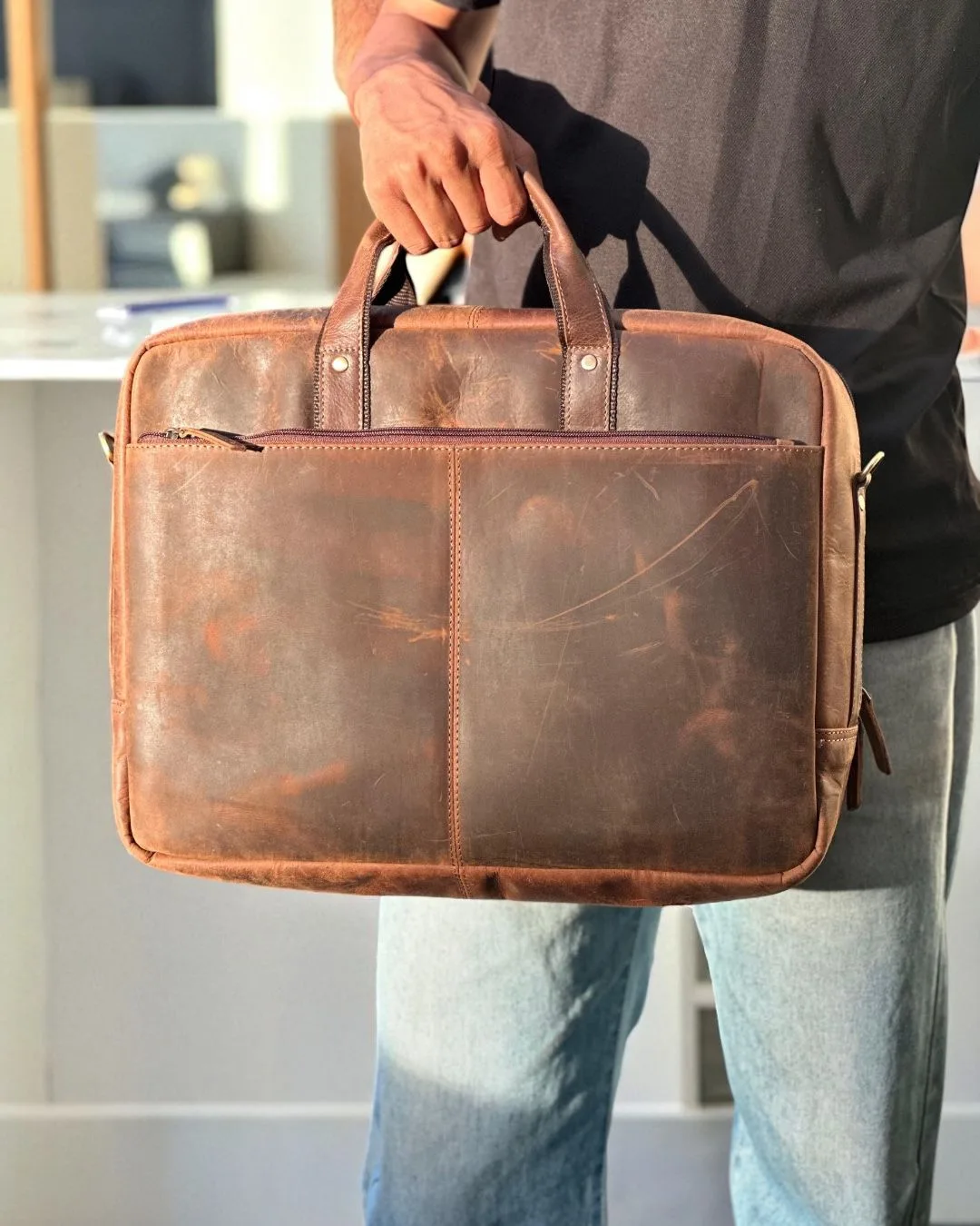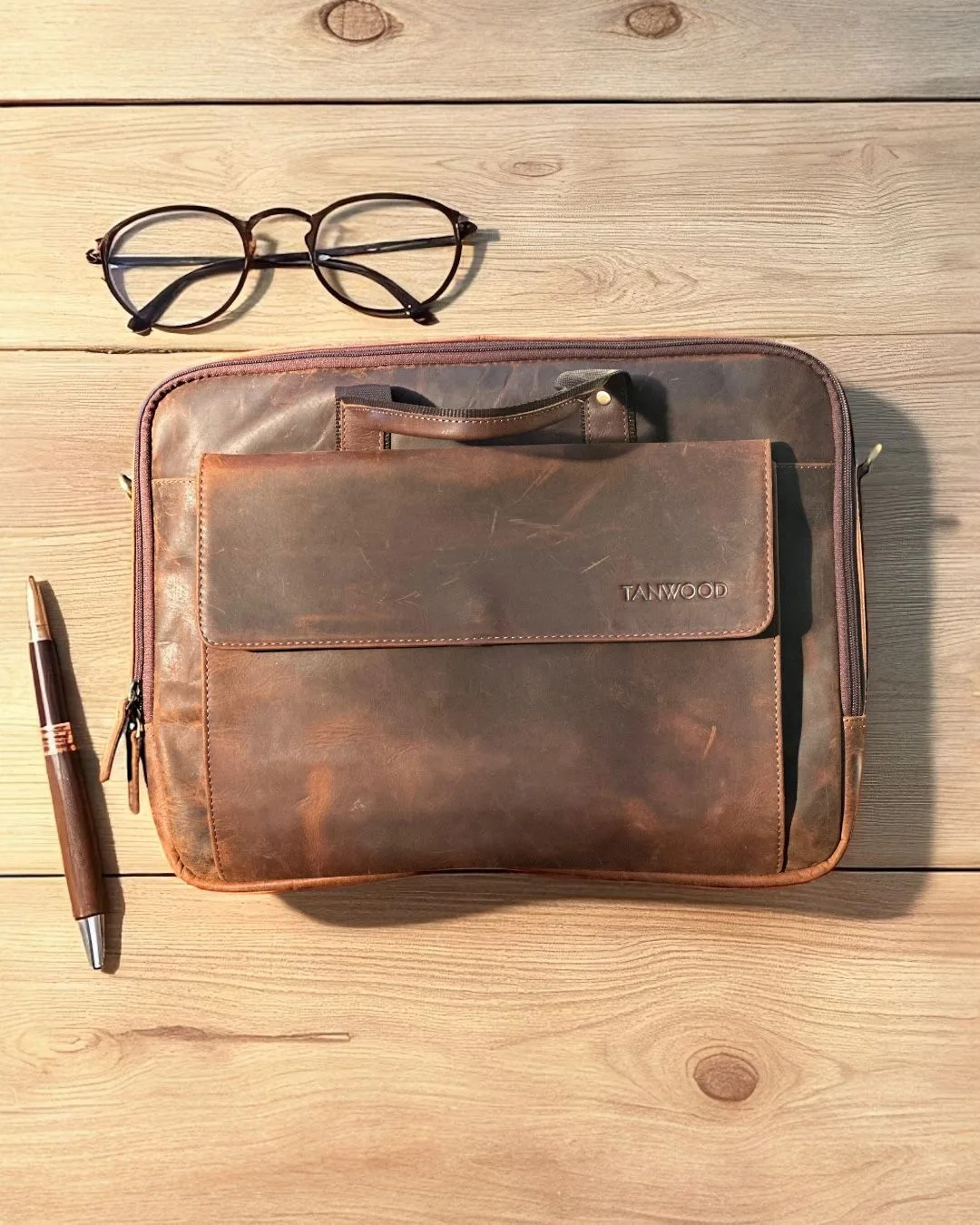 Tanwood Leather Executive Laptop Sleeve combines elegance and functionality for the modern professional. Handcrafted from premium leather, it features a magnetic flap compartment for quick access items, a spacious main compartment for your laptop or documents, and an outer zipper pocket to keep essentials secure. Thoughtfully designed with a pen holder and two extra slots, it helps you stay organized wherever you go. With its rich vintage texture and sleek finish, this sleeve perfectly blends timeless style with everyday practicality — ideal for work, meetings, or travel.