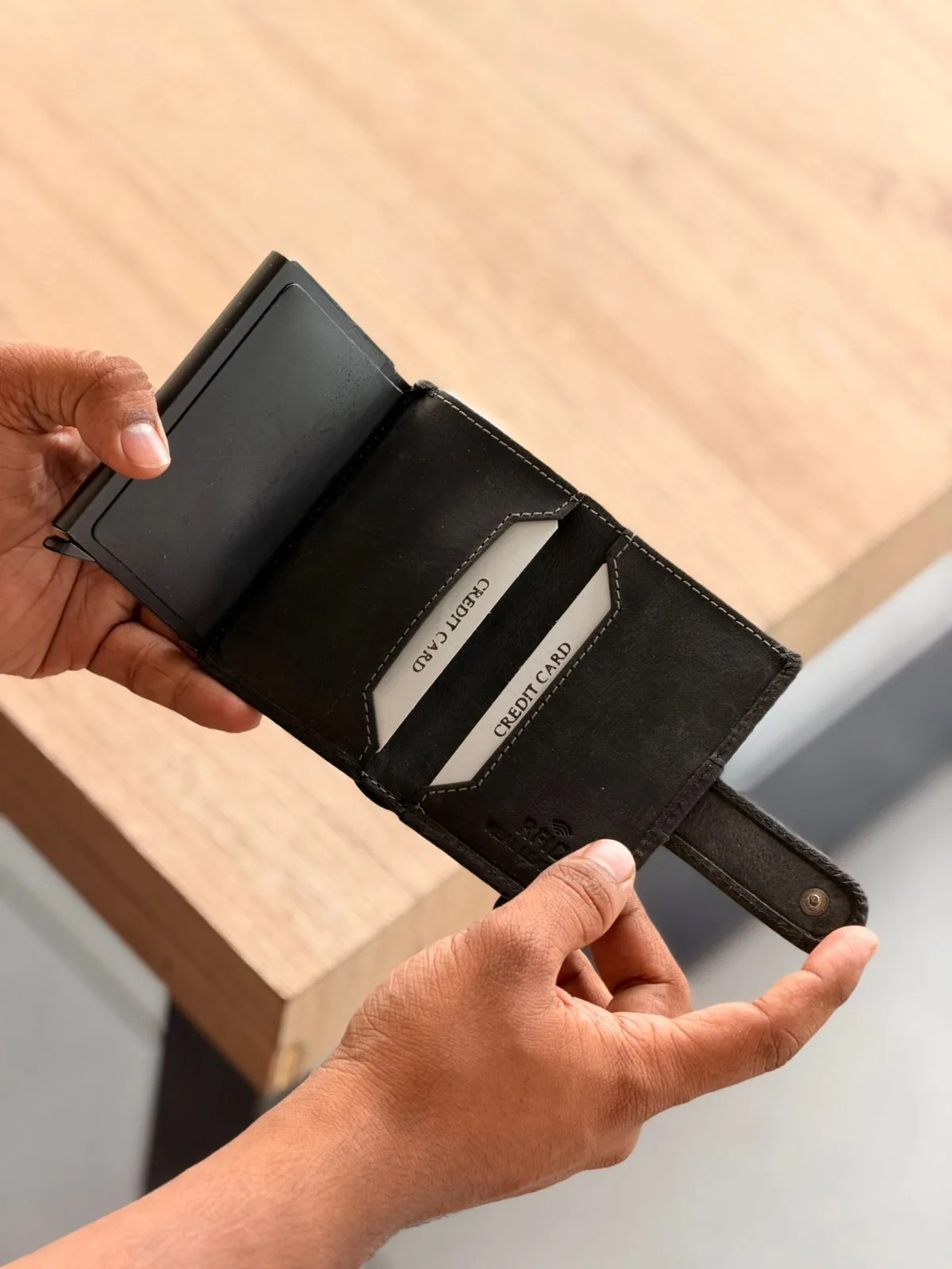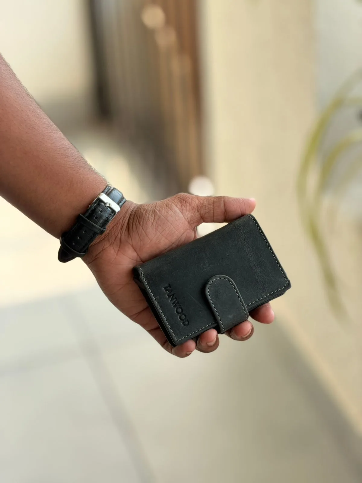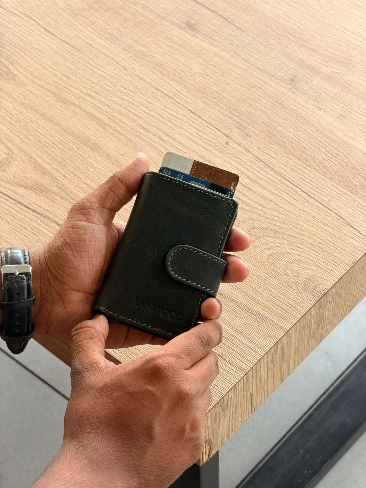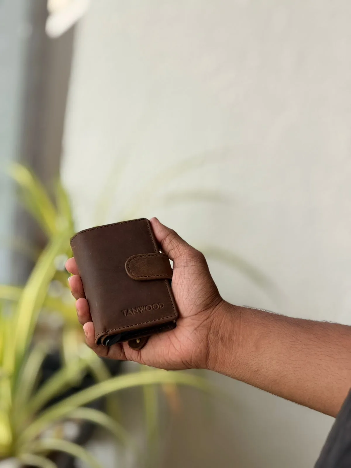 TANWOOD leather RFID pop-up card wallet is a new age stylish card wallet which can hold up to 8 cards, one cash compartment and one zipper for coins. This is made from vintage hunter buffalo leather .