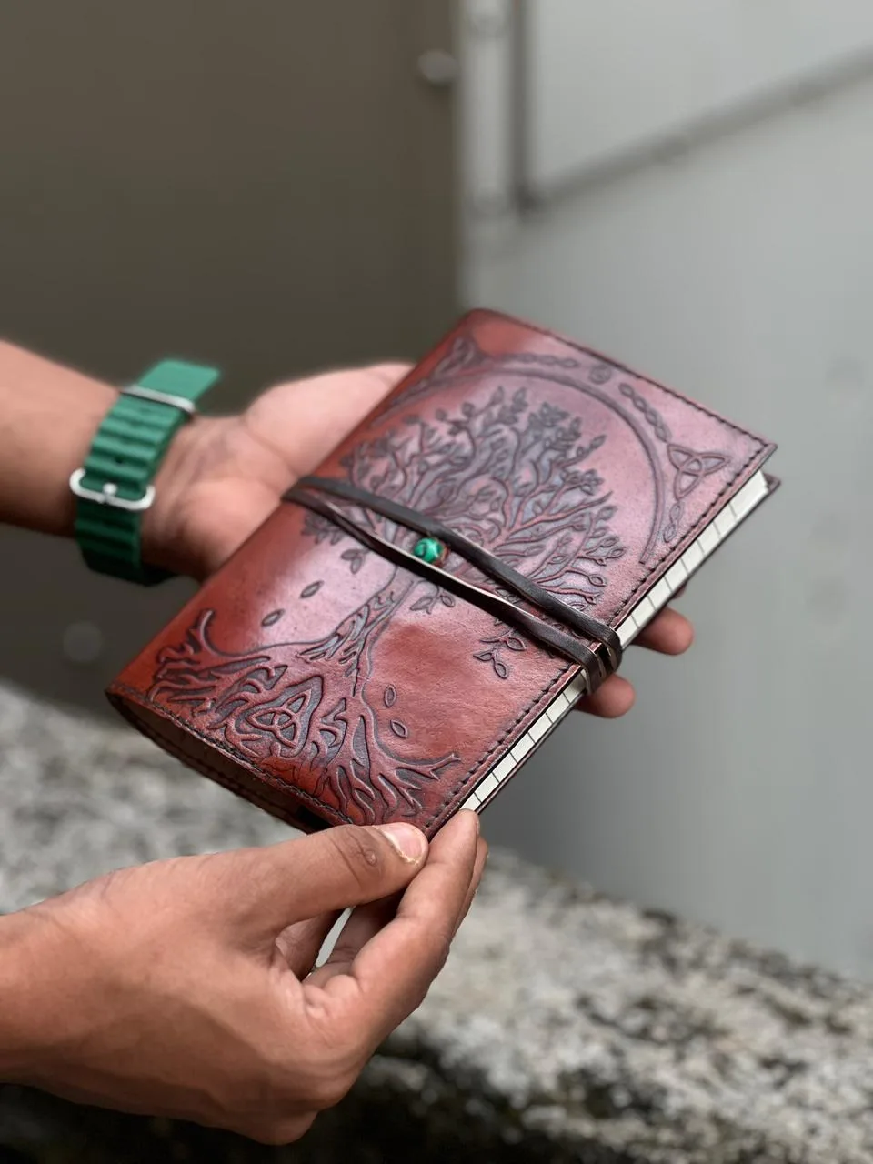 Crafted from premium genuine leather, this handmade leather journal features an elegant embossed Tree of Life design that adds a timeless, artistic touch. The wrap-around leather strap with a stone stud closure keeps your journal secure while enhancing its rustic charm.