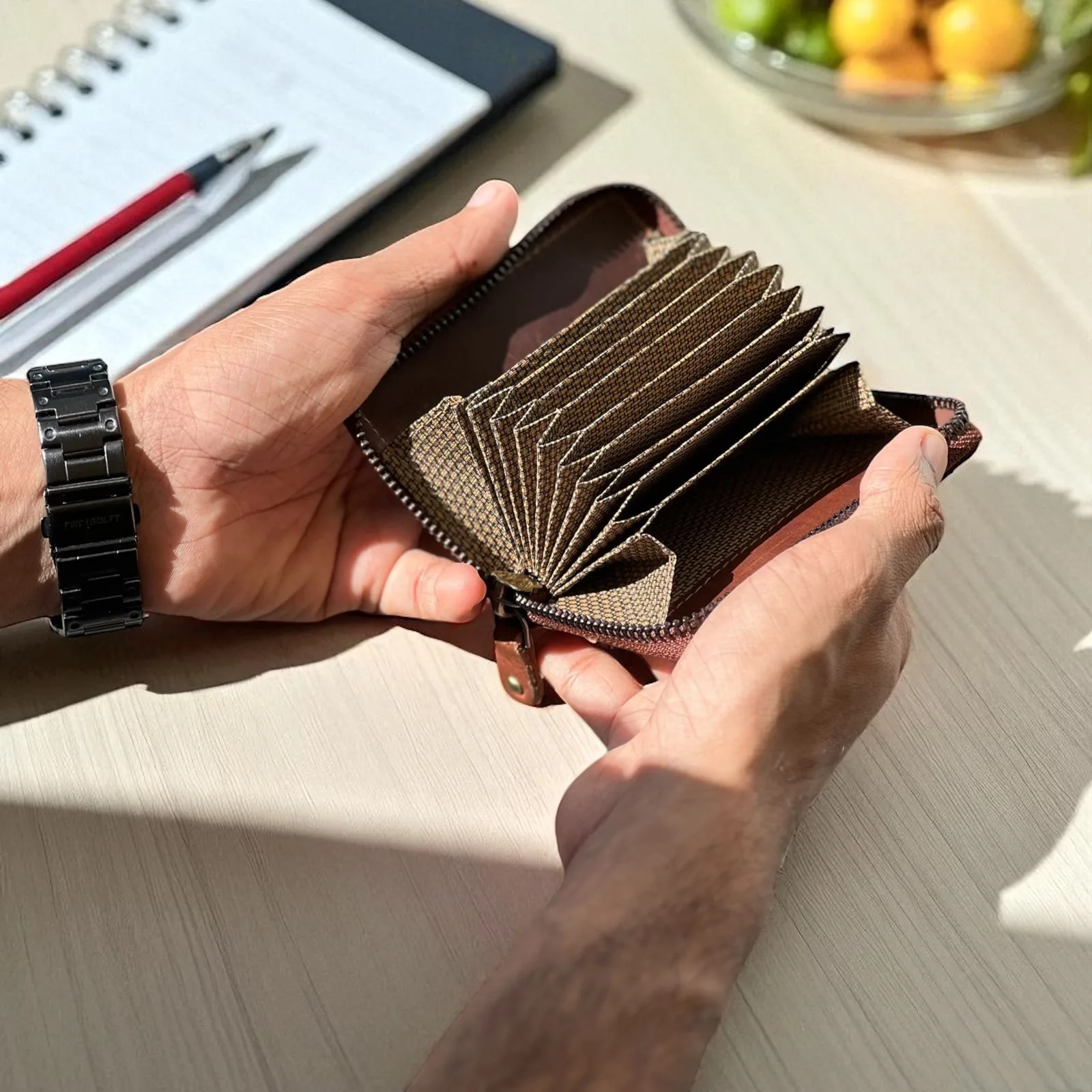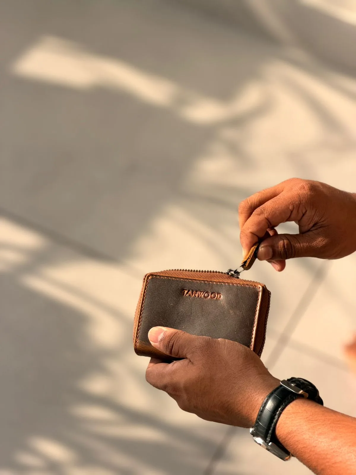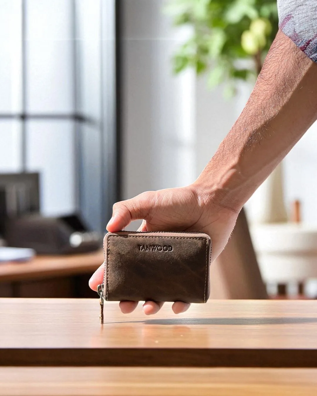 The Tanwood leather Zipvault wallet is crafted from premium leather, offering a sleek and durable design. Compact yet spacious, it securely holds your cards, cash, and coins with a smooth zip closure. A perfect blend of style and functionality for everyday carry. foldable cash up to 2000 can be inserted.