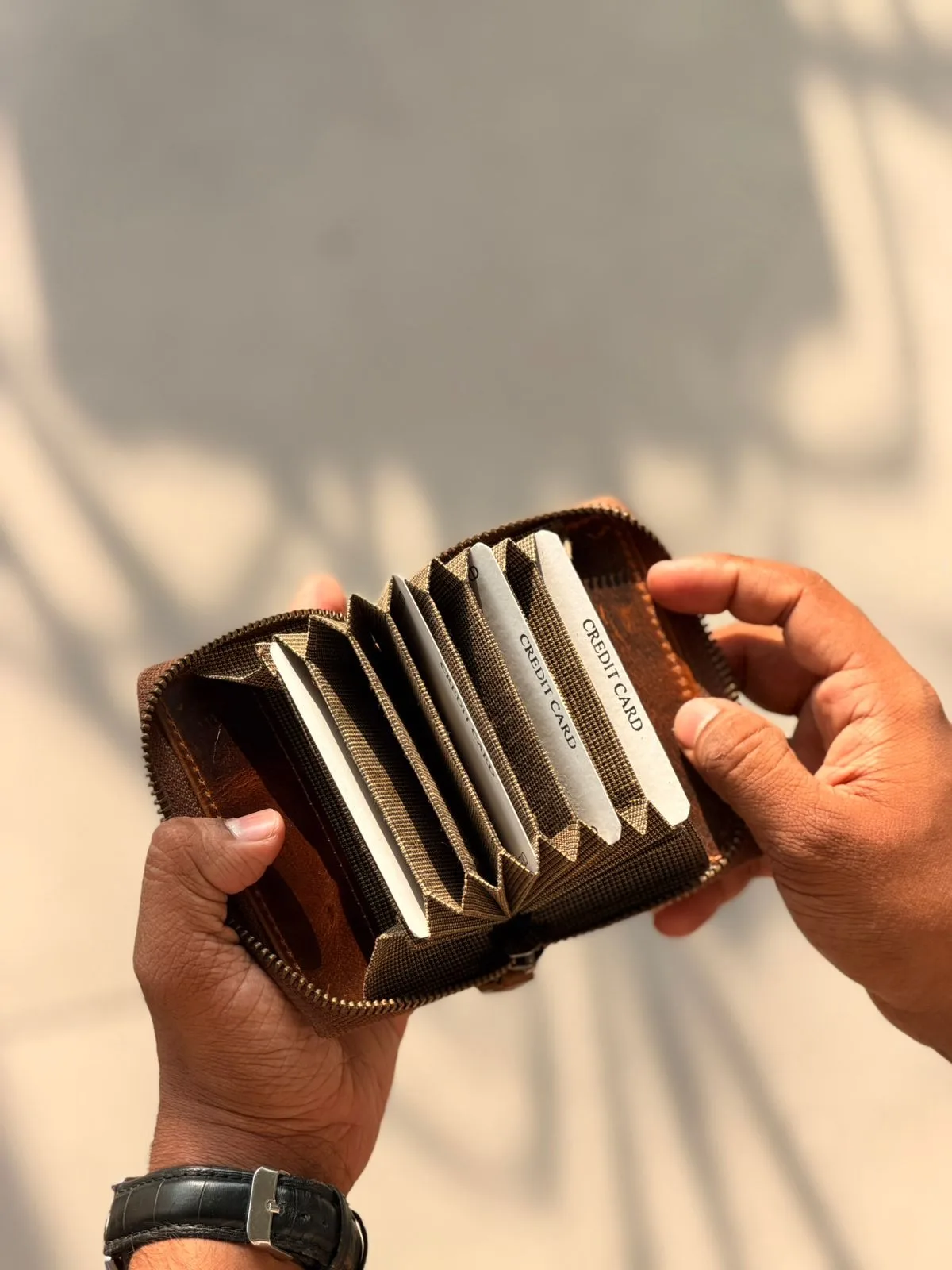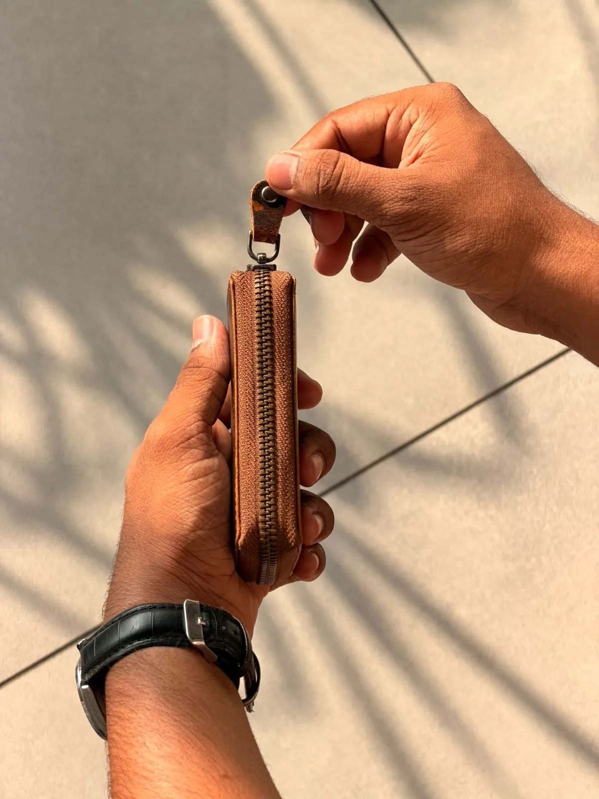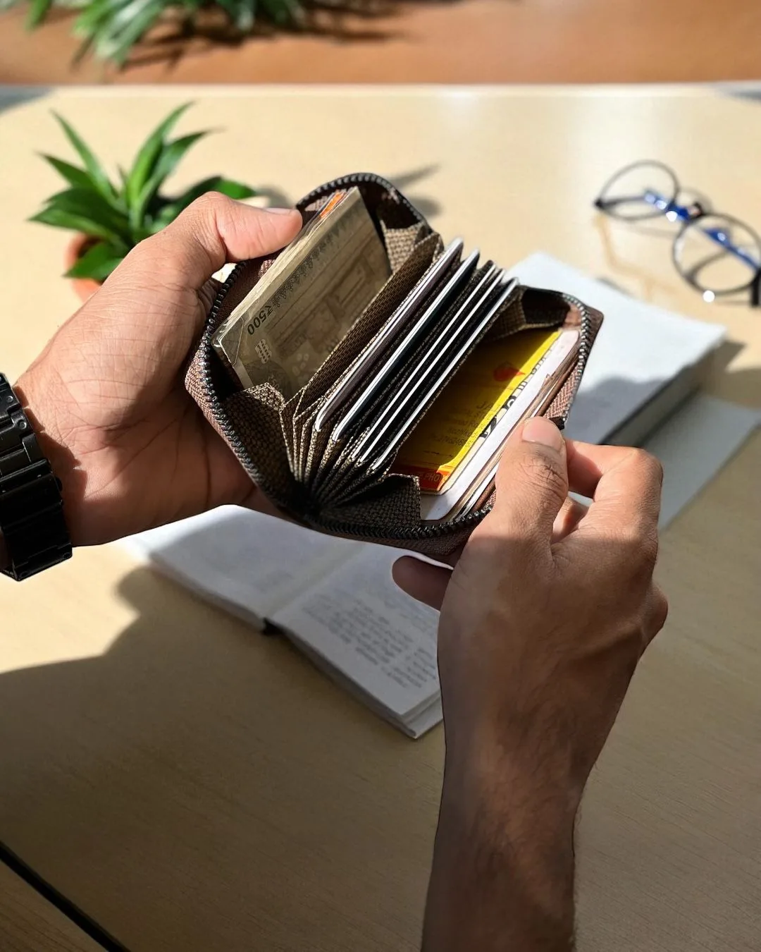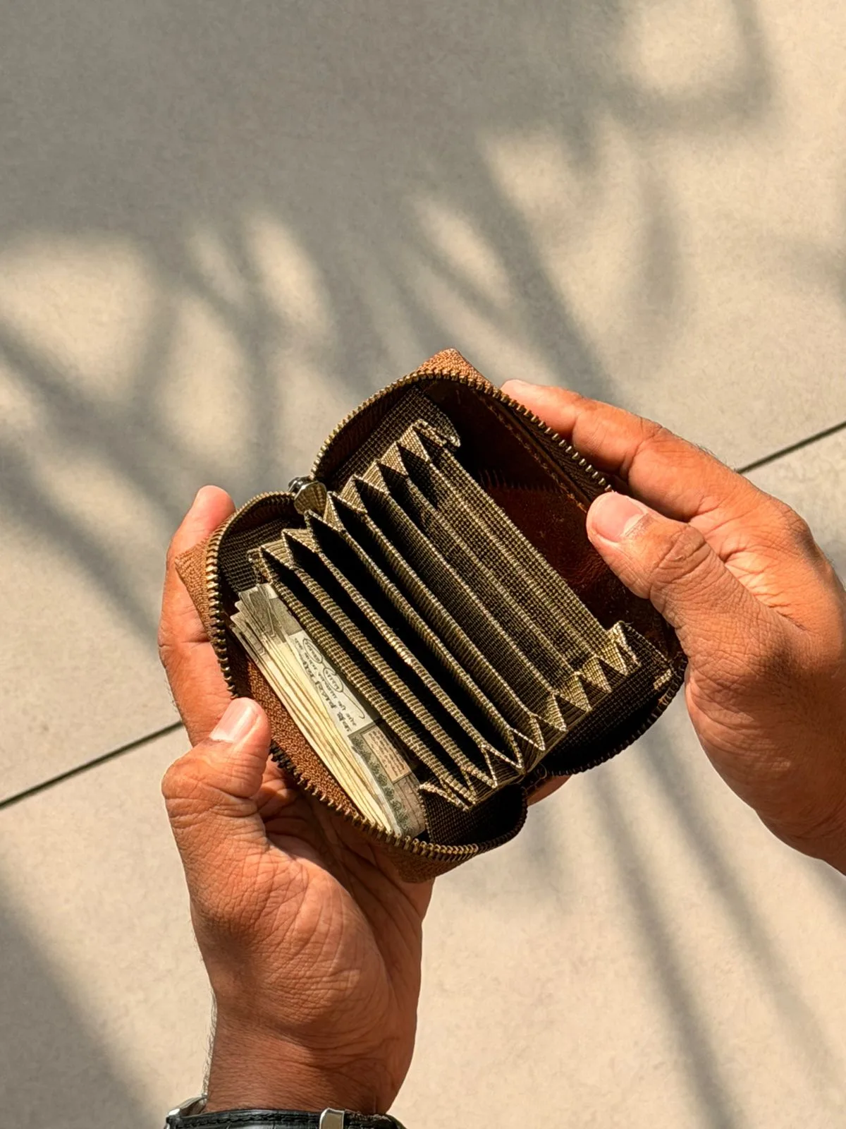 The Tanwood leather Zipvault wallet is crafted from premium leather, offering a sleek and durable design. Compact yet spacious, it securely holds your cards, cash, and coins with a smooth zip closure. A perfect blend of style and functionality for everyday carry. foldable cash up to 2000 can be inserted.