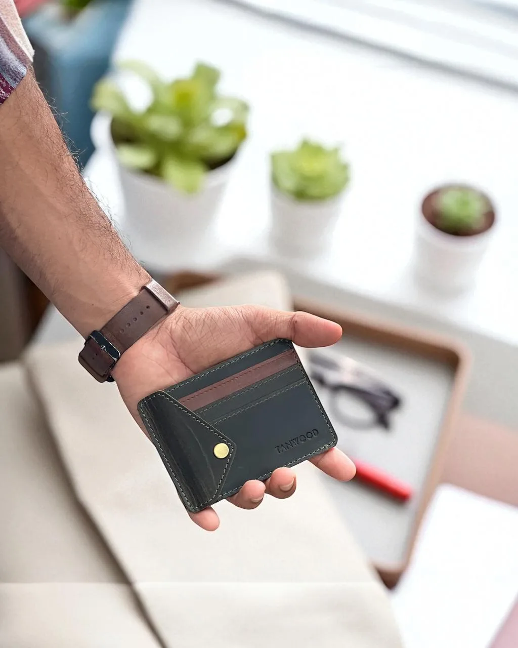 Discover the TANWOOD leather Vertex card holder wallet with 3 card slots and 1 cash compartment. Slim, stylish, and perfect for everyday carry.
