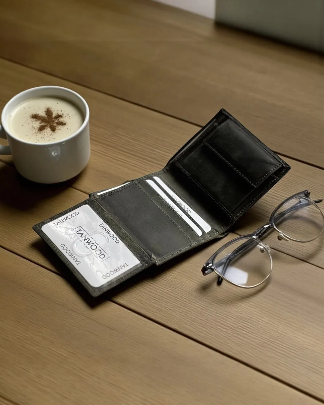 - TANWOOD Pure leather minimal Crunch Leather GIFT wallet with 8 card slots, 2 cash compartments and one coin pocket.