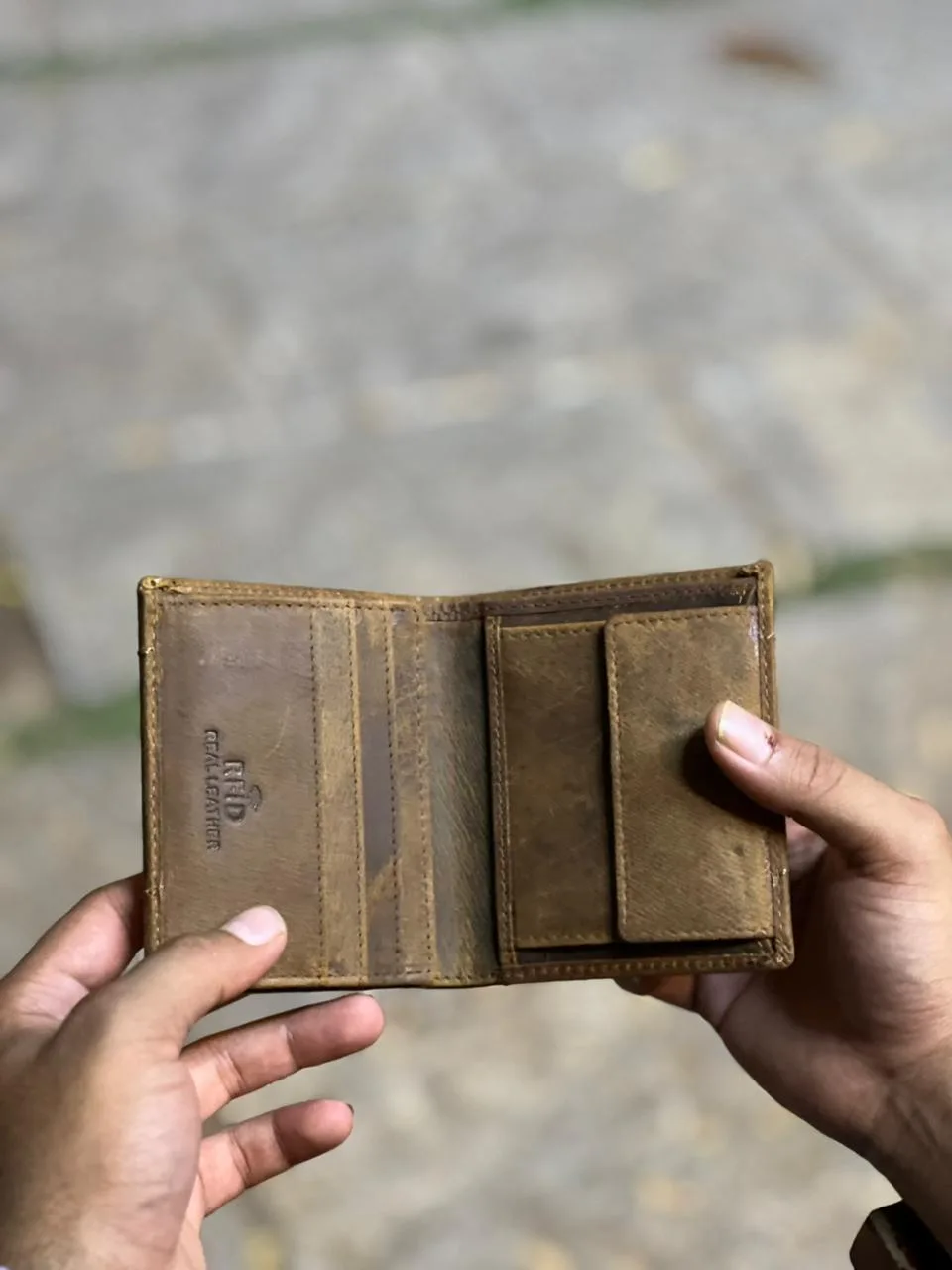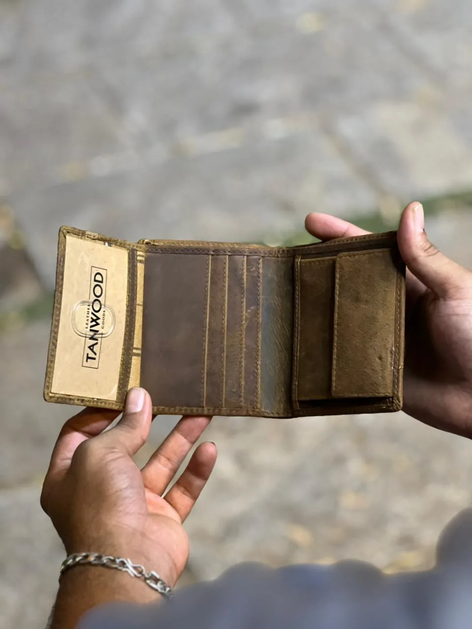 TANWOOD pure Leather hunter unisex flap wallet with button closure. this wallet can hold around ten thousand rupees cash and 10 to 12 cards and a zipper for keeping coins . slim and stylish wallet for both men and women.
