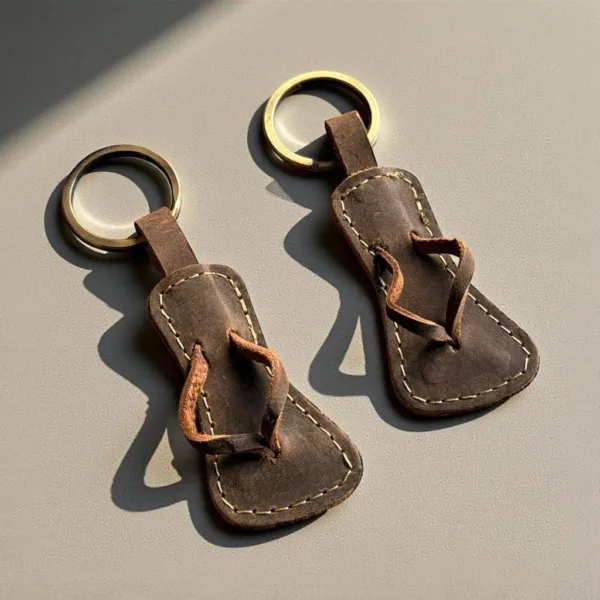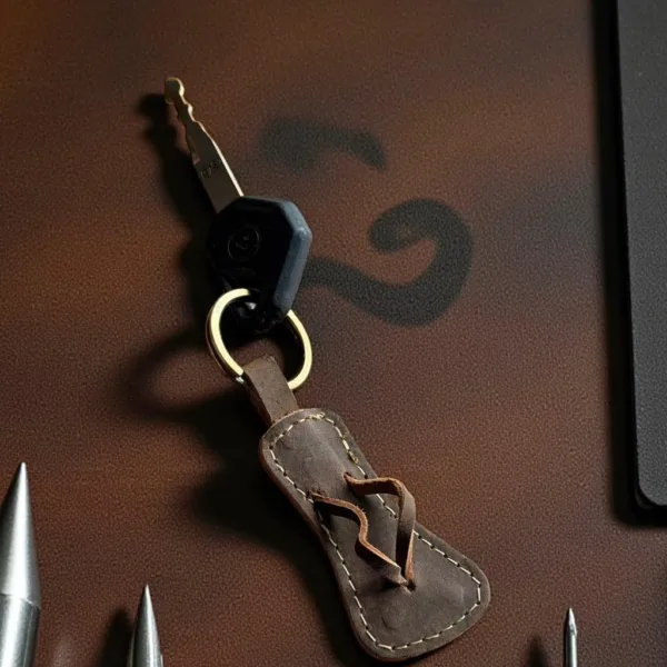 Add a touch of charm to your everyday essentials with this handcrafted leather Slipper keychain. Designed in a unique mini–flip-flop shape, it features premium vintage-finish leather, strong hand-stitched detailing, and a sturdy metal key ring for secure attachment. The soft leather straps enhance its rustic appeal, making it both stylish and durable. Perfect for car keys, house keys, or as an attractive accessory for bags and backpacks, this keychain also makes a thoughtful, one-of-a-kind gift. A blend of craftsmanship and creativity, it’s a small accessory that adds big character to your daily carry.