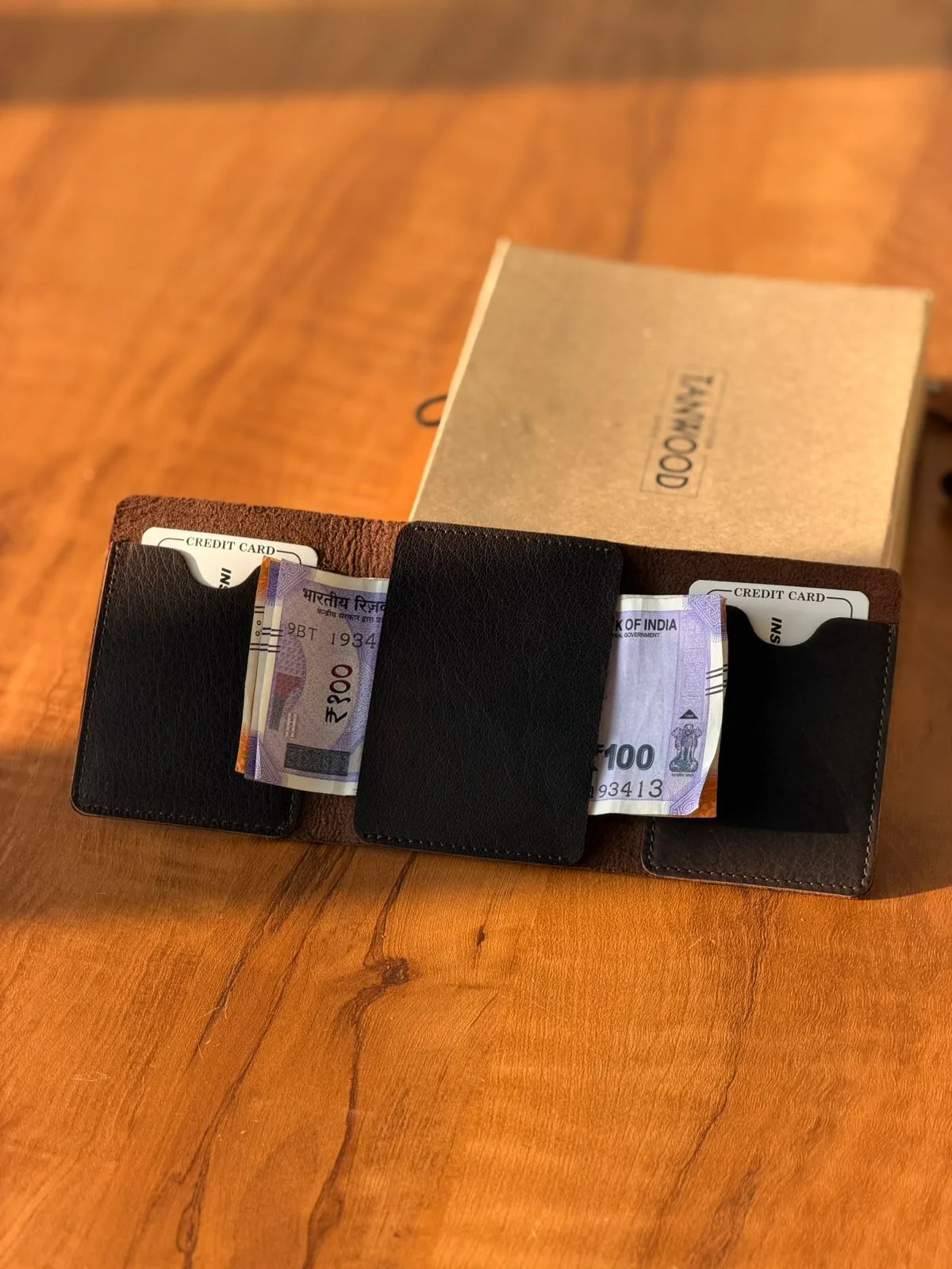 TANWOOD pure leathertrifold button wallet is slim sleek little wallet with minimalistic design , it has middle portion where you can keep cash inside , 3 seperate card slots also included . item available in three colours . grab your full leather trifold wallet now itself.